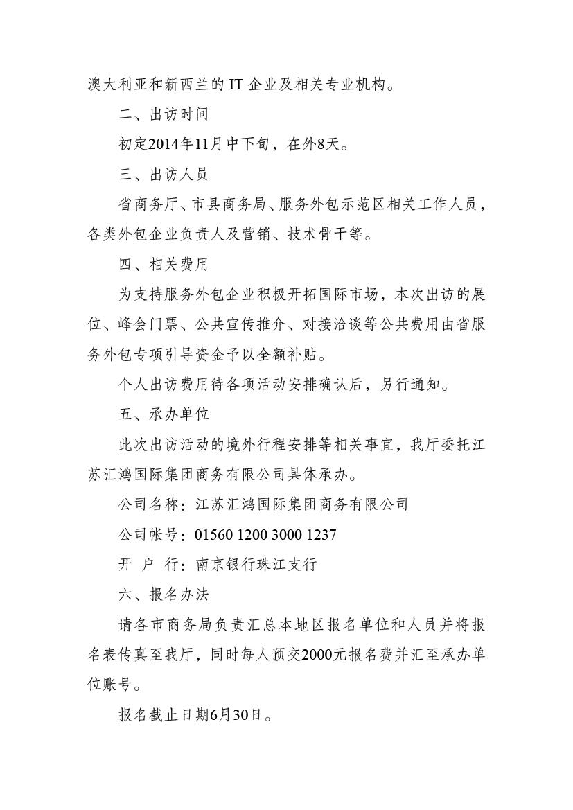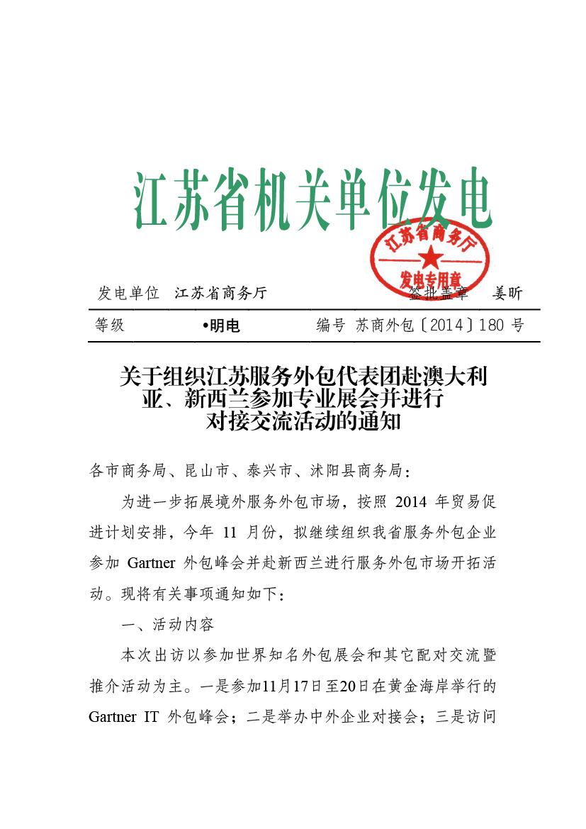 關(guān)于組織江蘇服務外包代表團赴澳大利亞、新西蘭參加專業(yè)展會并進行對接交流活動的通知
